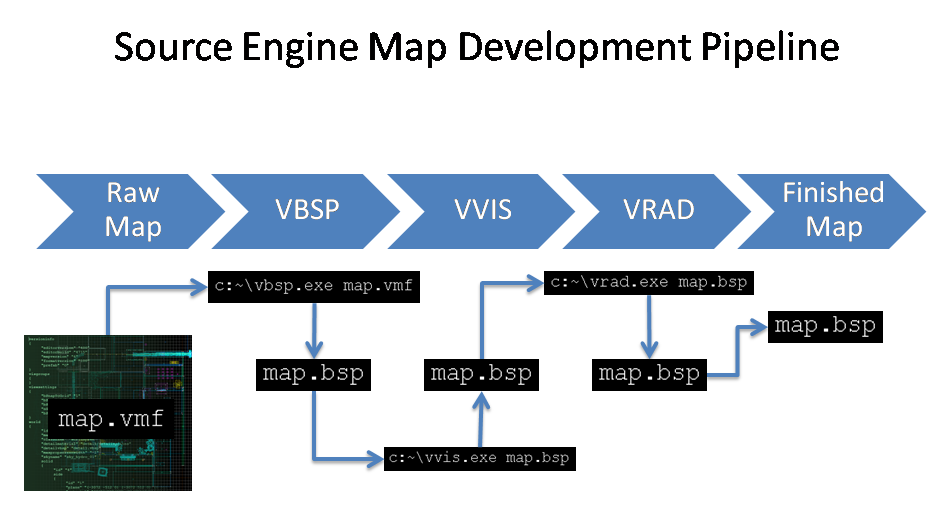 Hammer est un éditeur de map permettant de transformer une map que l'on a dessinée vers un format pouvant être lu par le moteur du jeu. Plusieurs conversions sont faite d'abord, on met le fichier .vmf qui est un fichier texte vers le format .bps, puis on découpe l'espace avec vis, pour l'optimisation et on finit par calculer la lumière avec rad.