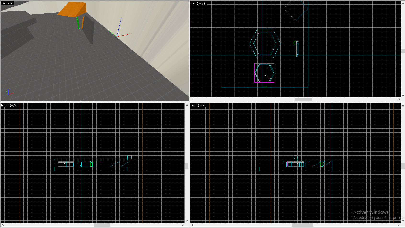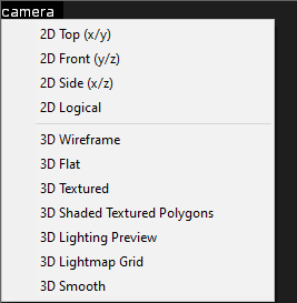 La première "View" caméra est une "3D Textured Polygons", la deuxième view est une "2D top (x/y)", la troisième view est une "2D front (y/z)" la quatrième view est une "2D side (x/z)".