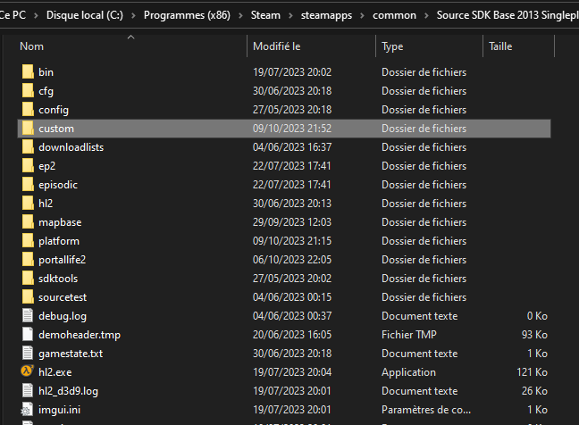 Dans les fichiers du jeu dont nous voulons en faire un mod crée un dossier avec le nom du mod dans notre exemple, nous allons l'appeler "custom"