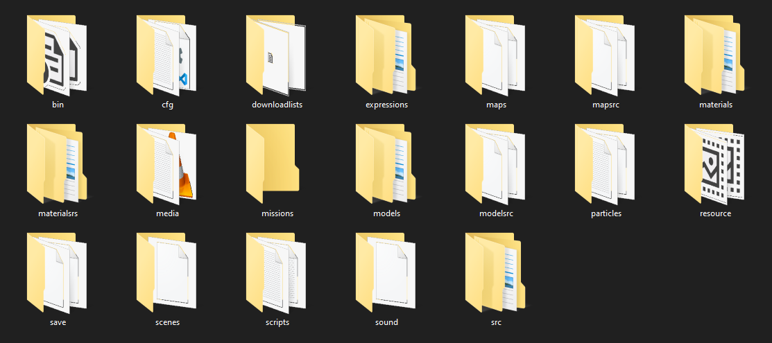 Les dossiers sources (modelsrc, src, materialsrc) sont uniquement destinée aux développeurs. Ils contiennent les fichiers non compilé pour le moteur.