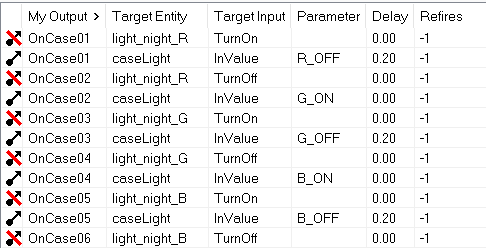 Dans l'exemple au dessus nous avons 6 états possible, ces états définise l'état de 3 lumières, 1 rouge, 1 verte, 1 bleue. - case 1 (R_ON) : Met l'entité "light_night_R" sur on, puis après un delay vas entrer dans l'etat 2. - case 2 (R_OFF) : Met l'entité "light_night_R" sur off, puis après un delay vas entrer dans l'etat 3. - case 3 (G_ON) : Met l'entité "light_night_G" sur on, puis après un delay vas entrer dans l'etat 4. - case 4 (G_OFF) : Met l'entité "light_night_G" sur on, puis après un delay vas entrer dans l'etat 5. - case 5 (B_ON) : Met l'entité "light_night_B" sur on, puis après un delay vas entrer dans l'etat 6. - case 6 (B_OFF) : Met l'entité "light_night_B" sur on, puis après un delay vas entrer dans l'etat 1.